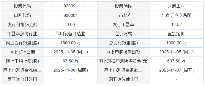 今日申购:大鹏工业 Harerhama 岛田大鹏工业株式会社 主办单位(总经理):东方证券股份有限公司 刊发状态: 公司简介: 公司是中国领先的专注于精密工业清洗领域的智能装备制造商。公司产品和服务主要应用于车辆推进系统、新能源电气系统等核心零部件精密清洗领域3,满足下游客户的精密制造需求。同时,我公司将积极利用我国制造业高质量发展趋势,基于现有业务技术经验和市场资源,加快机器视觉检测产品的设计,并将形成第二条业务发展曲线。截至招股说明书签署日,博德实业拥有公司68.72%的股份,为公司第一大股东。截至招股说明书签署之日,李鹏堂先生直接持有本公司11,809,800股(持股比例25.42%),通过哈德工业间接持有本公司26,243,400股(间接持股比例56.48%)。而且,李俊堂和李鹏堂是兄弟,是与李鹏堂合作的人。李俊堂先生通过博德实业间接持有本公司5,686,800股股份,间接持股比例为12.24%。李鹏堂先生通过直接、间接持股和集体行动,控制公司4,374万股投票权,占发行人总股本的94.13%。自公司成立以来,李鹏堂一直担任公司总裁兼首席执行官,对公司产生了直接重大影响关于公司的管理决策。总之,李鹏堂为实际管理人,报告期内未发生变化。据泰禾实业2025年11月3日发布的招股书显示,公司拟募集资金12,890.66万元,用于智能工业清洗设备生产研发基地项目(二期)和机器视觉检测设备研发中心项目。大宝工业于2025年11月3日公告向不特定合格投资者公开发行股票并在银行和北京证券交易所上市,表明如果发行成功,公司预计将募集资金总额1.35亿元。预计扣除发行费用1546.24万元(不含增值税)后净利润为11953.76万元。