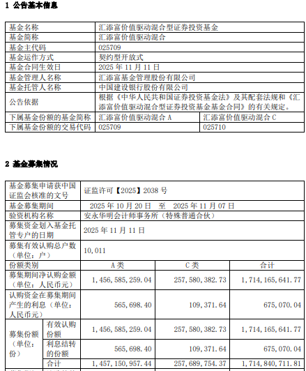 中国经济网北京11月12日电 汇添富基金今日就汇添富价值牵头的混合型证券投资基金协议的有效性发布公告。融资期内认购净额为1,714,165,641.77元,融资期内认购资金应计利息为675,070.04元,募集股份总数为1,714,840,711.81元。基金经理蔡志文于2014年7月加入汇添富基金管理有限公司担任行业分析师,自2019年12月4日起担任基金经理。