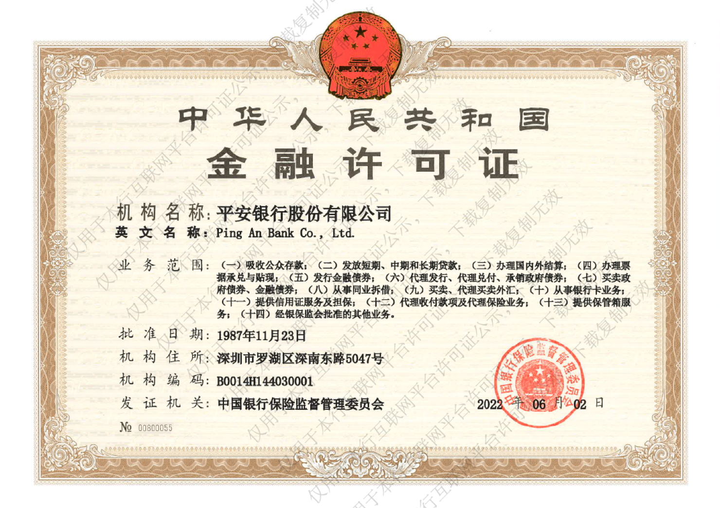 1。安装名称:Bank Co.,Ltd。英文名称:Ping A Bank Co.,Ltd。